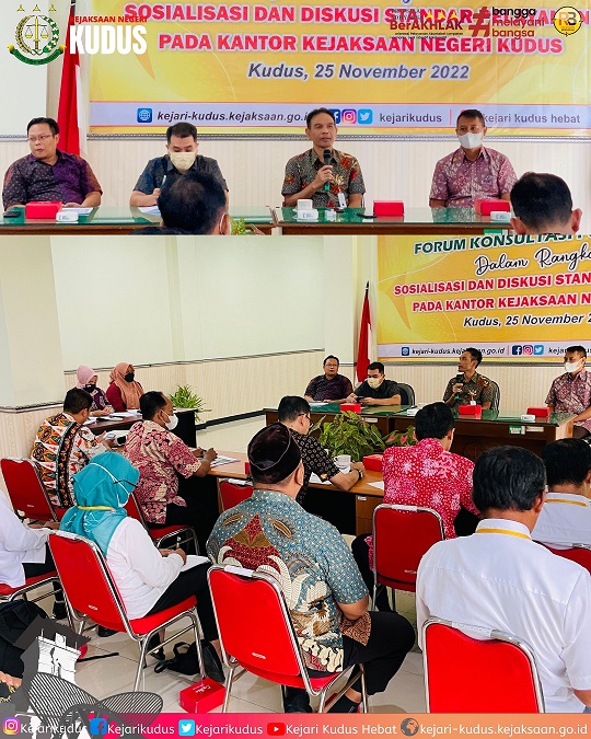 Jum’at, 25 November 2022 Kejaksaan Negeri Kudus mengadakan acara kegiatan Forum Konsultasi Publik (FPK) dalam rangka Sosialisasi & Diskusi Standar Pelayanan Pada Kantor Kejaksaan Negeri Kudus.Acara yang diadakan di Aula lantai 1 Kejaksaan Negeri Kudus ini dibuka oleh Kepala Kejaksaan Negeri Kudus Ardian, S.H., M.H., serta di ikuti oleh Kasubagbin Kejaksaan Negeri Kudus, Para Kasi Kejaksaan Negeri Kudus, dan tamu undangan dari perwakilan Polres Kudus, Pengadilan Negeri, Badan Pertanahan Kab. Kudus, Rutan Kudus, Bea Cukai dan Kades Panjang.
