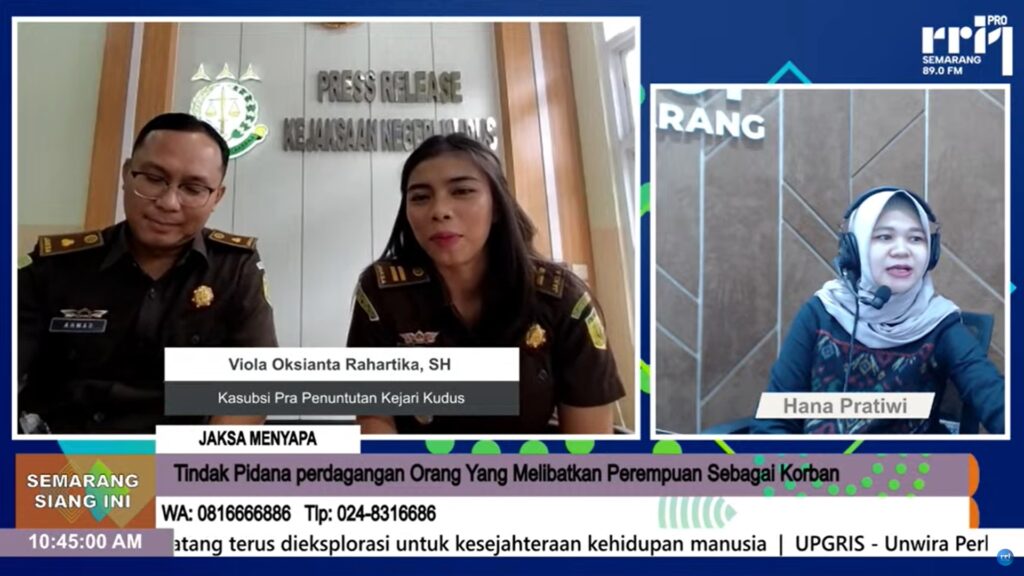 Pada hari Kamis, 25 April 2024, Kajaksaan Negeri Kudus menggelar kegiatan Jaksa Menyapa dengan tema yang mengangkat Tindak Pidana Perdagangan Orang yang melibatkan perempuan sebagai korban. Acara ini diselenggarakan secara daring melalui Studio RRI Semarang yang di pandu oleh Hana Pratiwi.